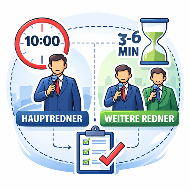 Klare Redezeiten schaffen Ordnung und erhöhen die Verständlichkeit. Ein Hauptredner sollte ausreichend Raum bekommen, weitere Beiträge eher kompakt bleiben. So entsteht ein Ablauf, der für Publikum, Organisatoren und Medien leichter nachvollziehbar ist.